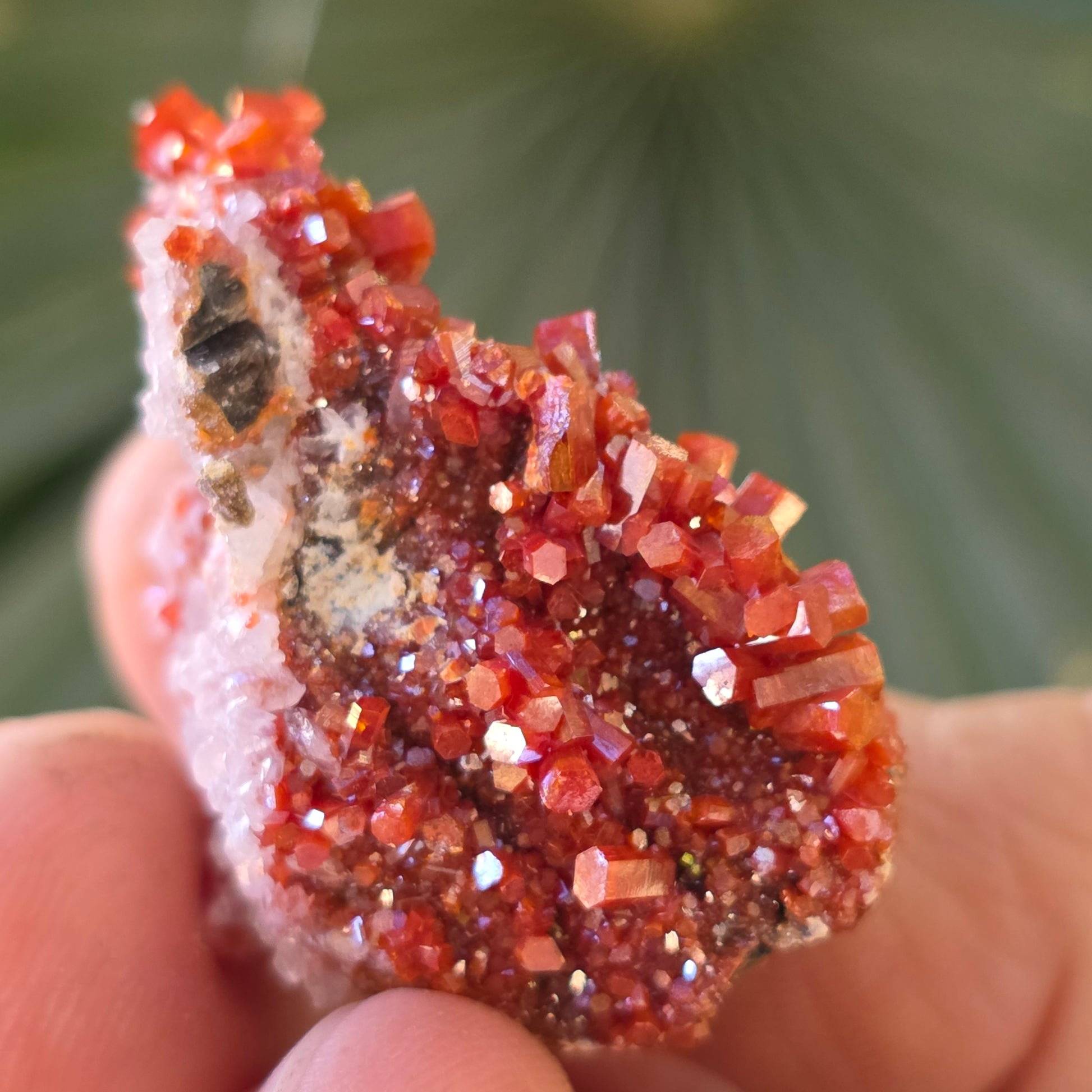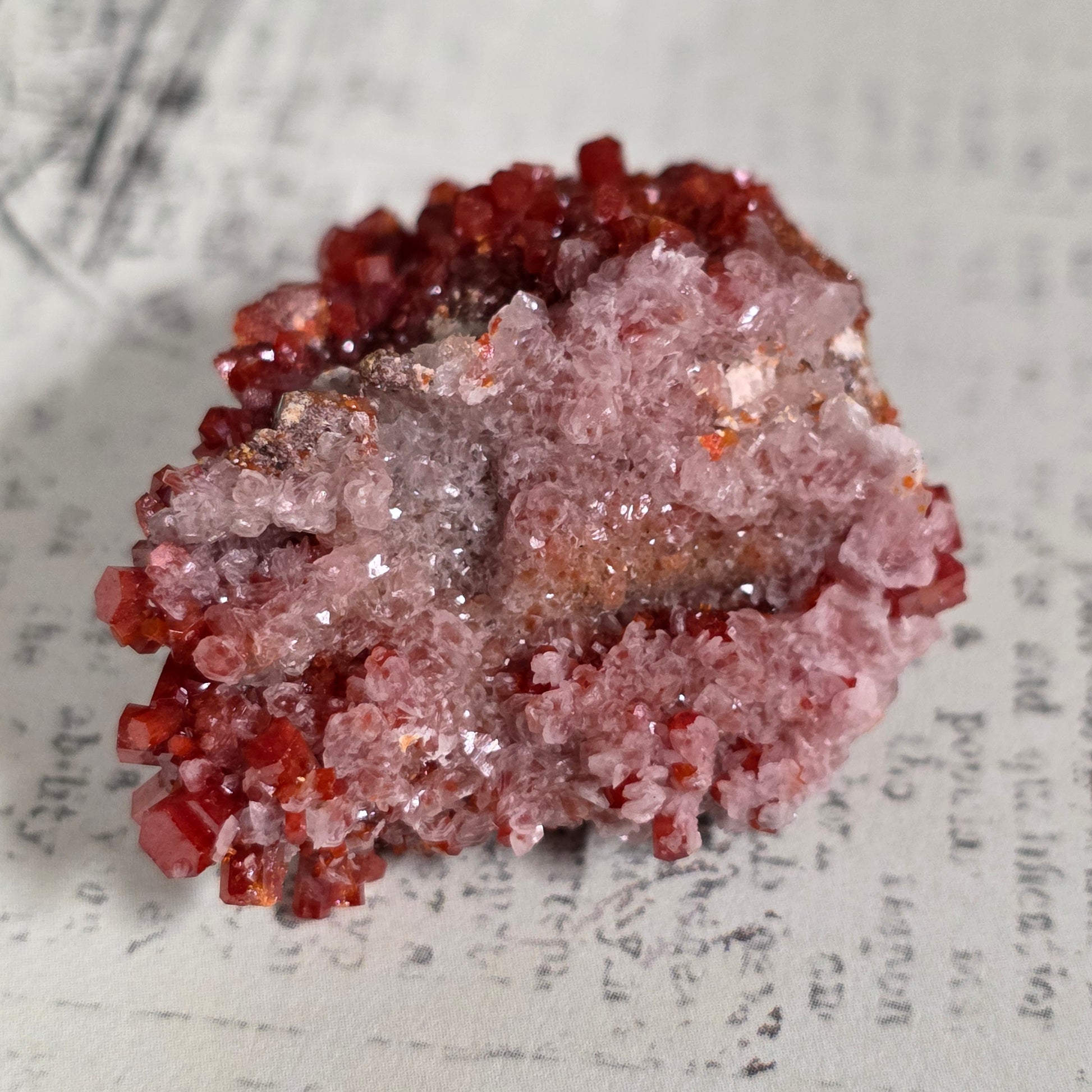 It has many well formed red gemmy hopper crystals blanketing the matrix rock with a shimmery calcite icing covering one side.