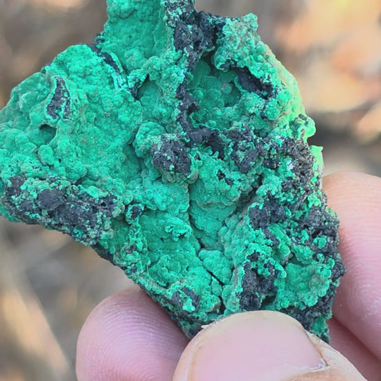 A gorgeous green copper carbonate mineral specimen, this rock features areas of botryoidal texture covering light-weight black matrix stone.