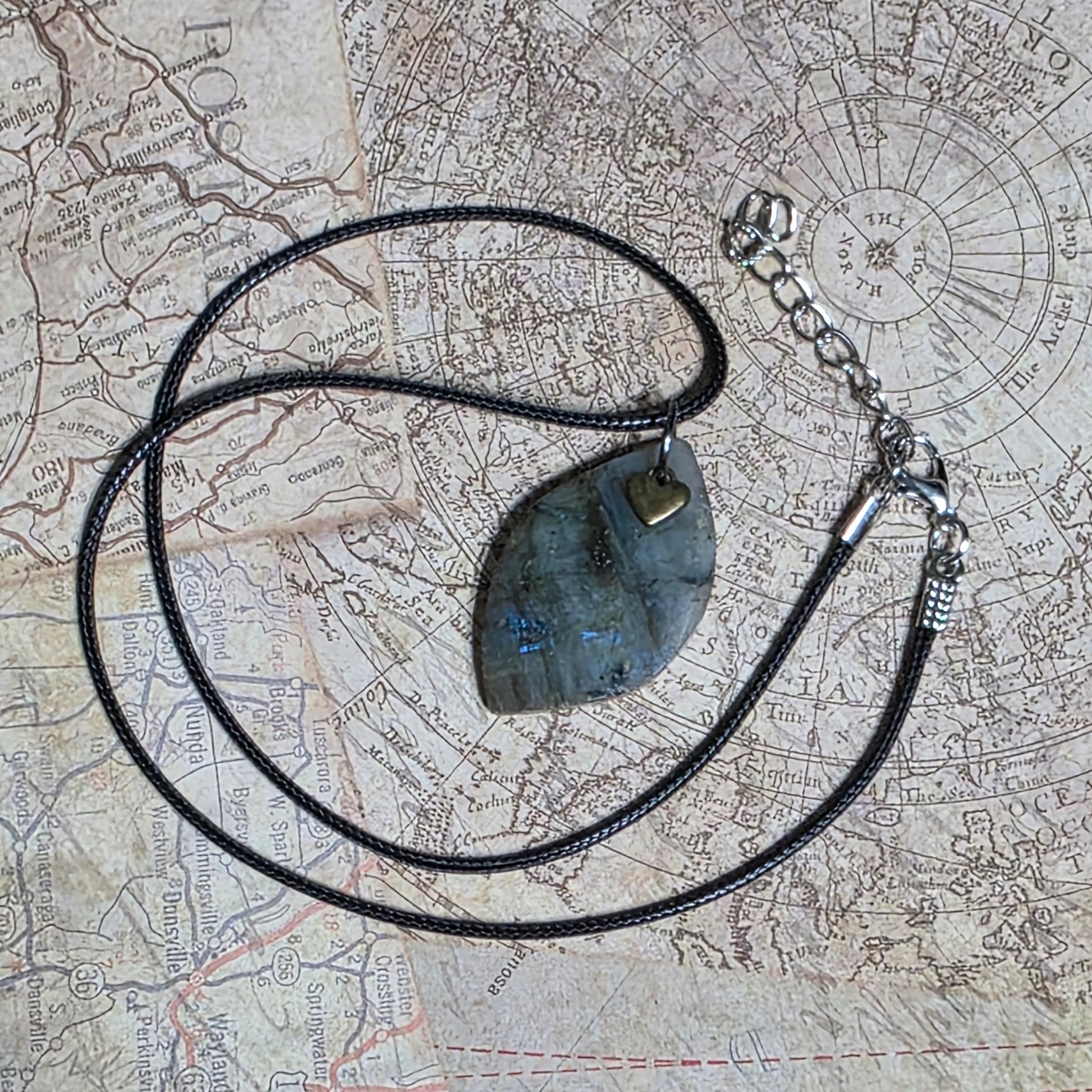 A delicate metal heart charm hangs at the front top of the labradorite, adding a sweet and personal touch. Whether worn daily or saved for special moments, this necklace makes a thoughtful gift for a loved one, or a meaningful treat for yourself.