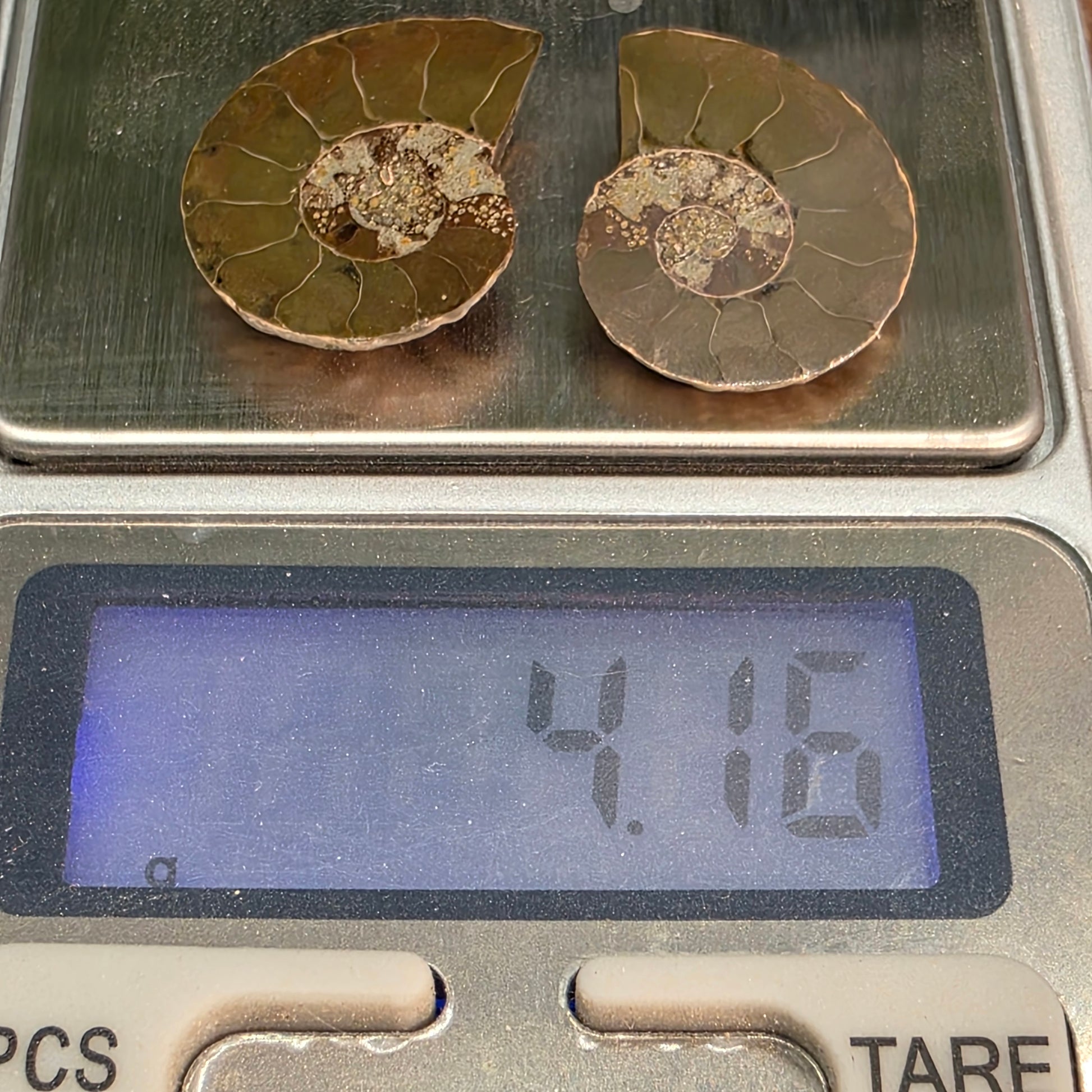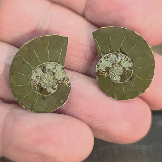 Natural Ammonite Fossil Cut and Polished Pair, Small Size Halves Brown with Iridescent Colors