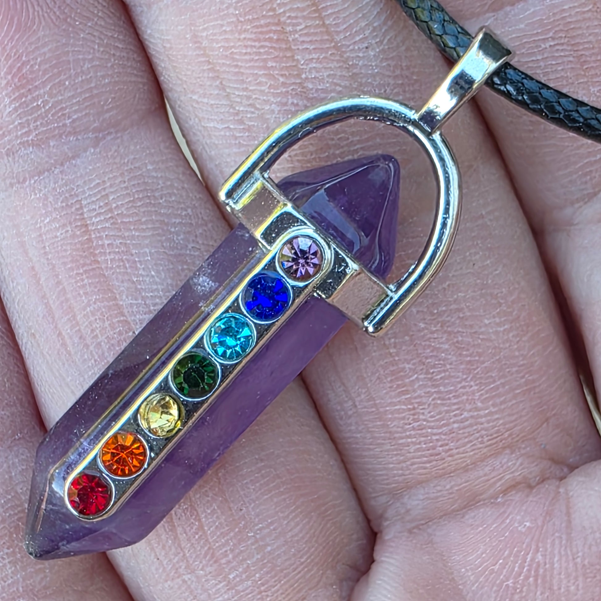Each chakra rainbow pendant features a polished hexagon-shaped gemstone that highlights its beauty and character.