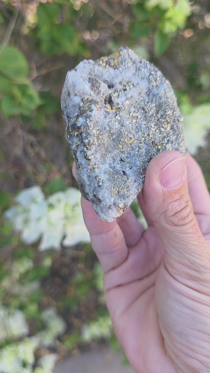 An interesting mineral specimen, with shiny golden colored pyrite and chalcopyrite mixed with quartz, weighing 198.11 grams.